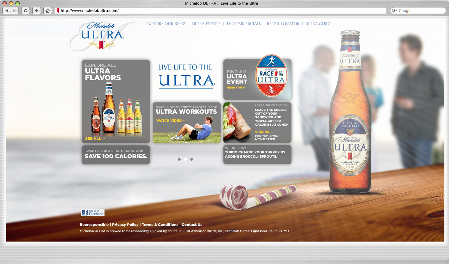 The site’s clean color palette of cream, blue, and white echoed Michelob Ultra’s crisp taste and modern aesthetic. Modular homepage components highlighted nutritional facts, fitness content, and social media integration with Facebook, Twitter, and Pandora—bridging active living with digital interaction. The platform was built to evolve with ongoing promotions, ensuring visual and functional consistency throughout the year.