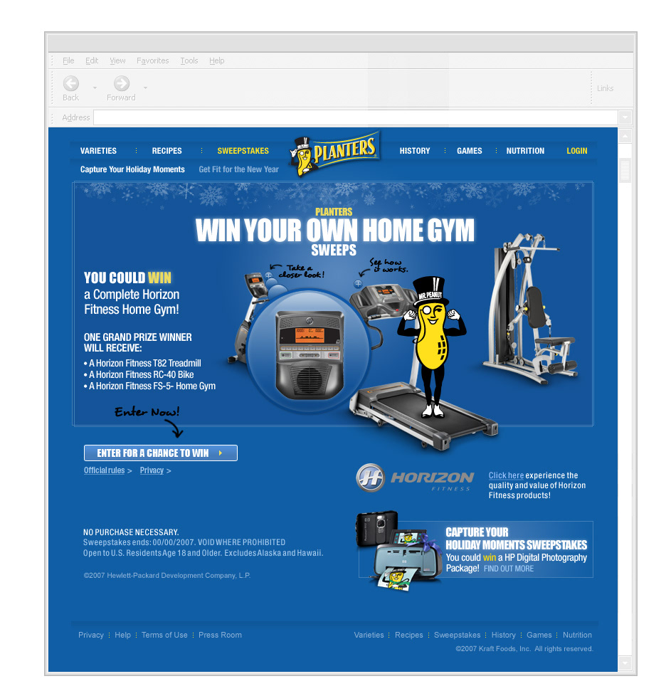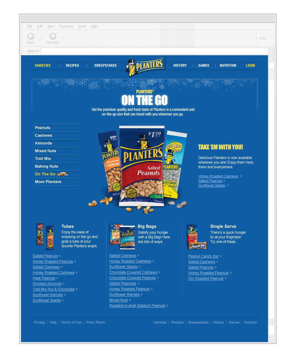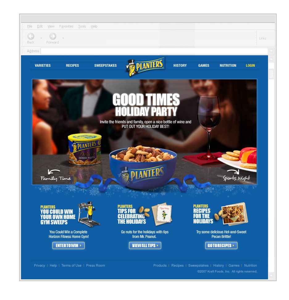 The campaign introduced Planters to new digital audiences and extended its brand voice across web and media platforms. Engagement exceeded expectations, with strong repeat visits and above-average click-through rates for rich media at the time. The work helped define Planters’ early digital presence and showed how a traditional snack brand could live comfortably in the humor-driven culture of the web.